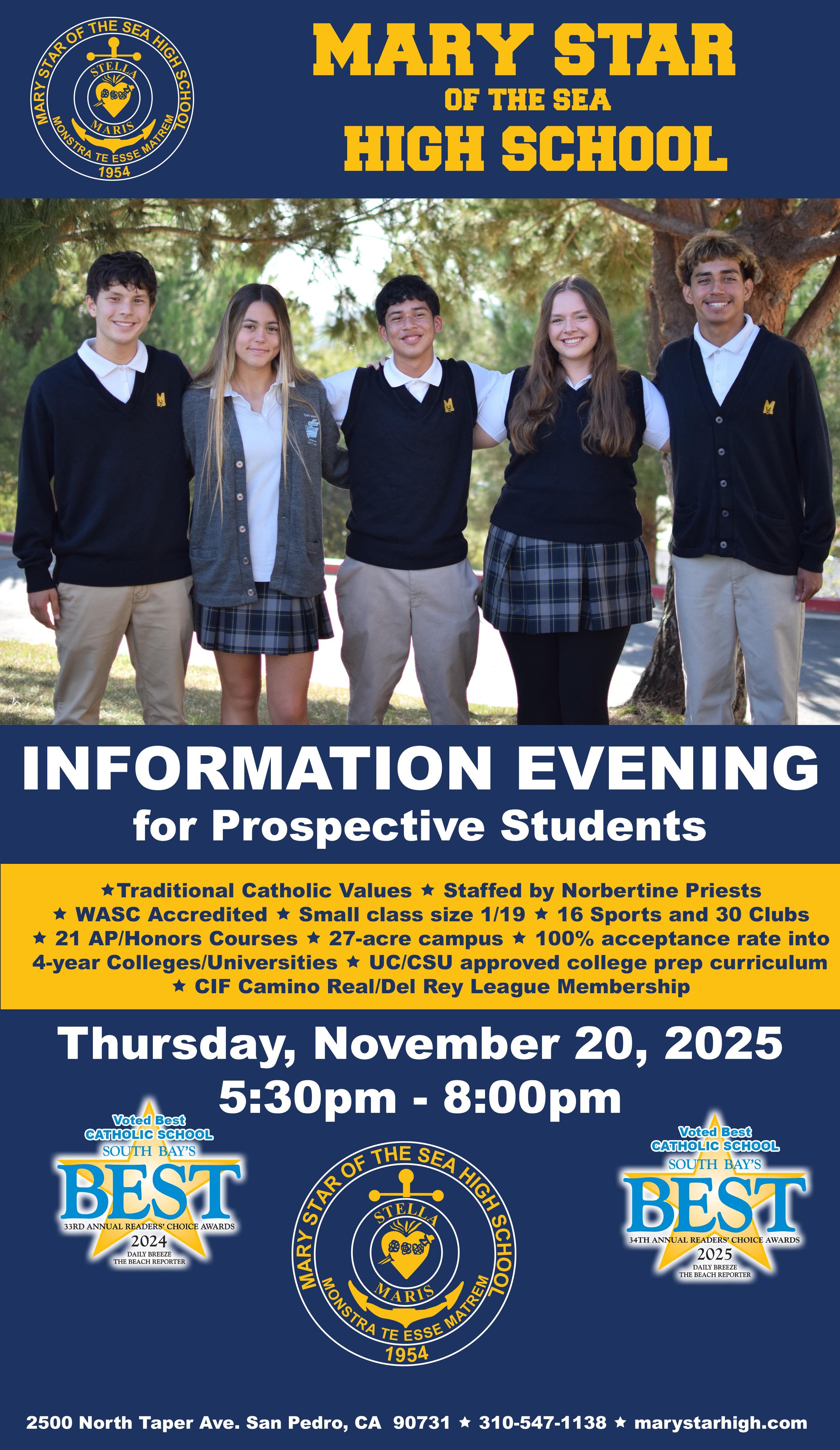 This is a great opportunity for prospective public and private school students and their parents to learn about the challenging and dynamic programs offered at Mary Star of the Sea High School. Have your questions answered, find out about the application process and receive complete information packets. For more information contact: Mary Star of the Sea High School at 310-547-1138. (Placement Exam - January 17, 2026 & Make-up exams January 31 and February 14, 2026.